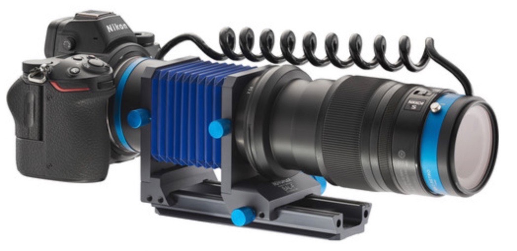 - Fotodiox Macro Bellows [advertiser link] — US$60 — This simple, all-manual bellows is the least expensive way of extending macro focus at the moment. While it has a tripod mount, that's at the camera end of the bellows; I strongly recommend adding a plate across the two supporting bars, particularly if you're using a heavier lens, such as the Nikon 105mm f/2.8 S. If you try to use this bellows with a heavy lens via the tripod socket, you put pressure on the two guiding bars that will eventually cause issues. The Fotodiox bellows has no electrical contacts, so using it you'll be all manual, all the time. That's generally not a problem with static macro subjects. The Fotodiox is a low-cost option that is useful for those just beginning to explore extreme macro with static subjects, or who do extreme macro rarely.
